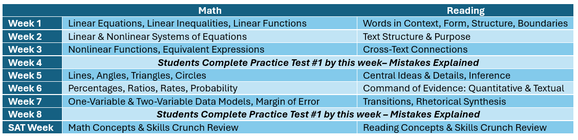 - Refresher session the week of the first SAT after the course has concluded